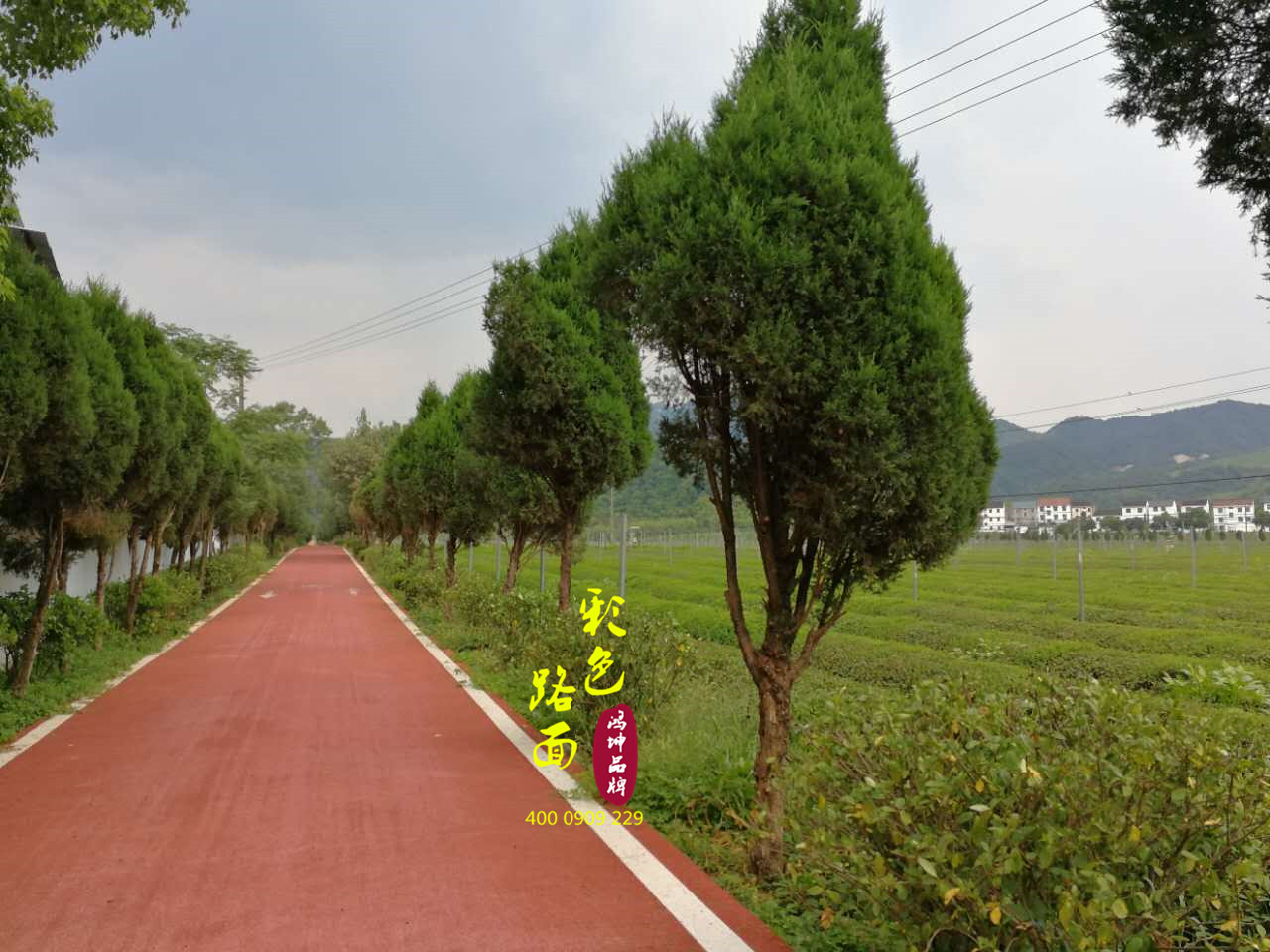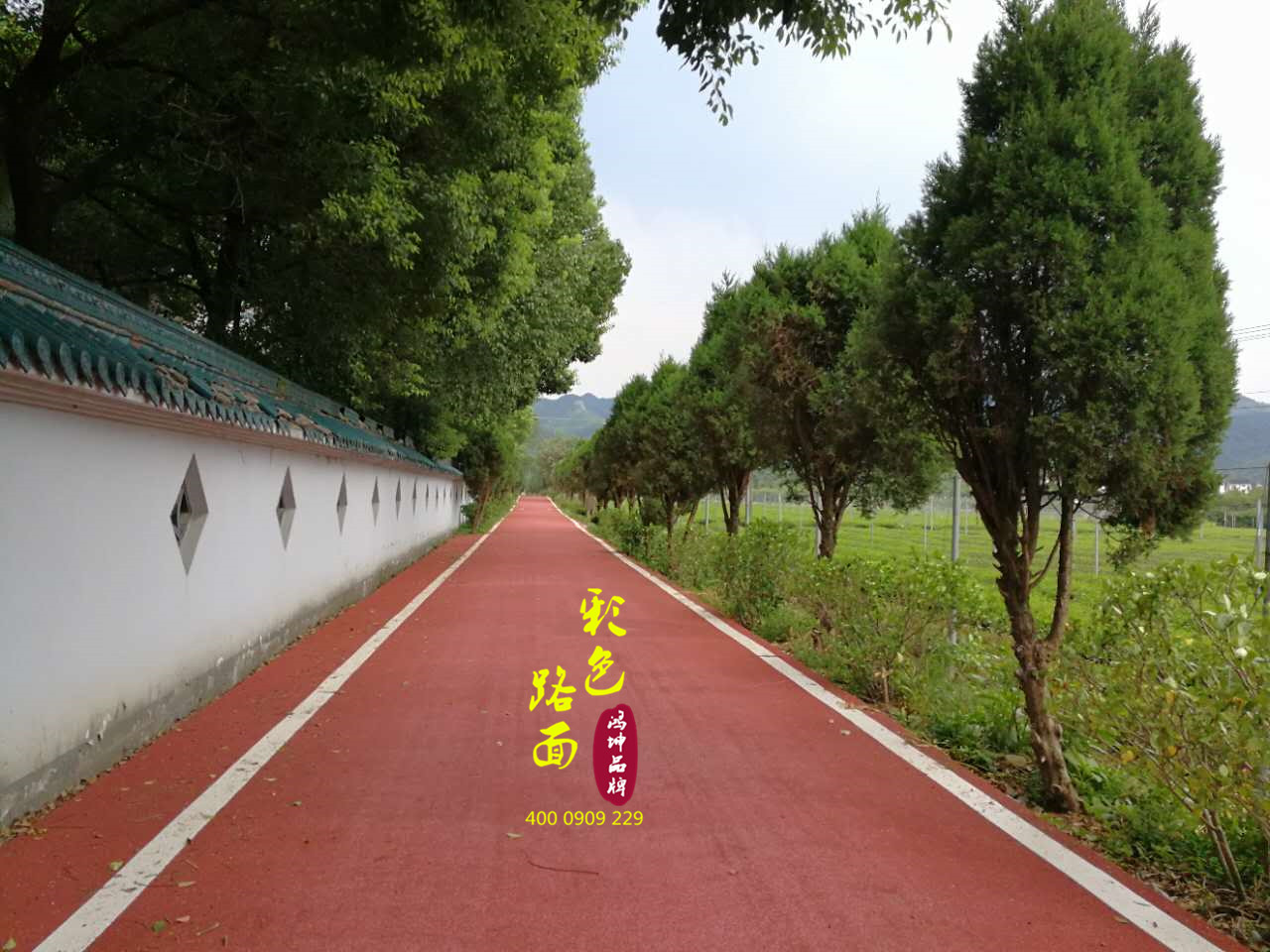 客戶評價:“抹茶小鎮周圍人行步道比較多,增加美觀色彩的同時也可以增加防滑耐磨功能,鴻坤的水性彩色路面材料確實不錯,沒有刺激性味道,施工工期也比較短,紅色的彩色路面和周圍的綠色環境搭配出一幅美好的景色!”