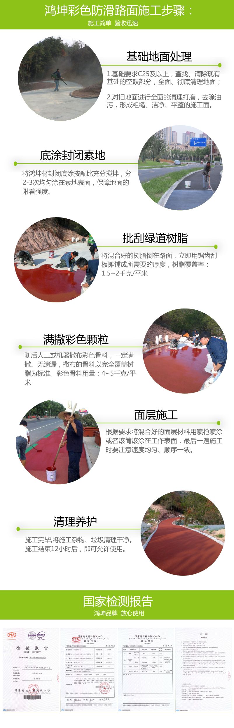 鴻坤彩色防滑路面(綠道)特點:路面散水性好、高度防滑、縮短剎車距離、安全可靠,美化環(huán)境、交通警示、降低噪音,是環(huán)境友好型地面材料。